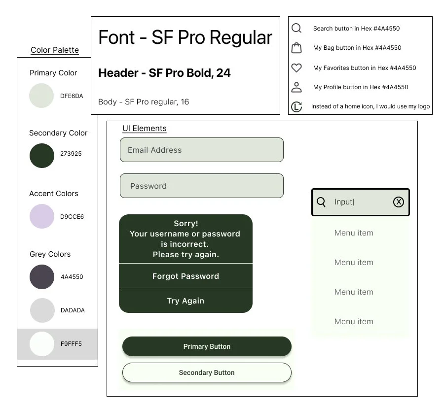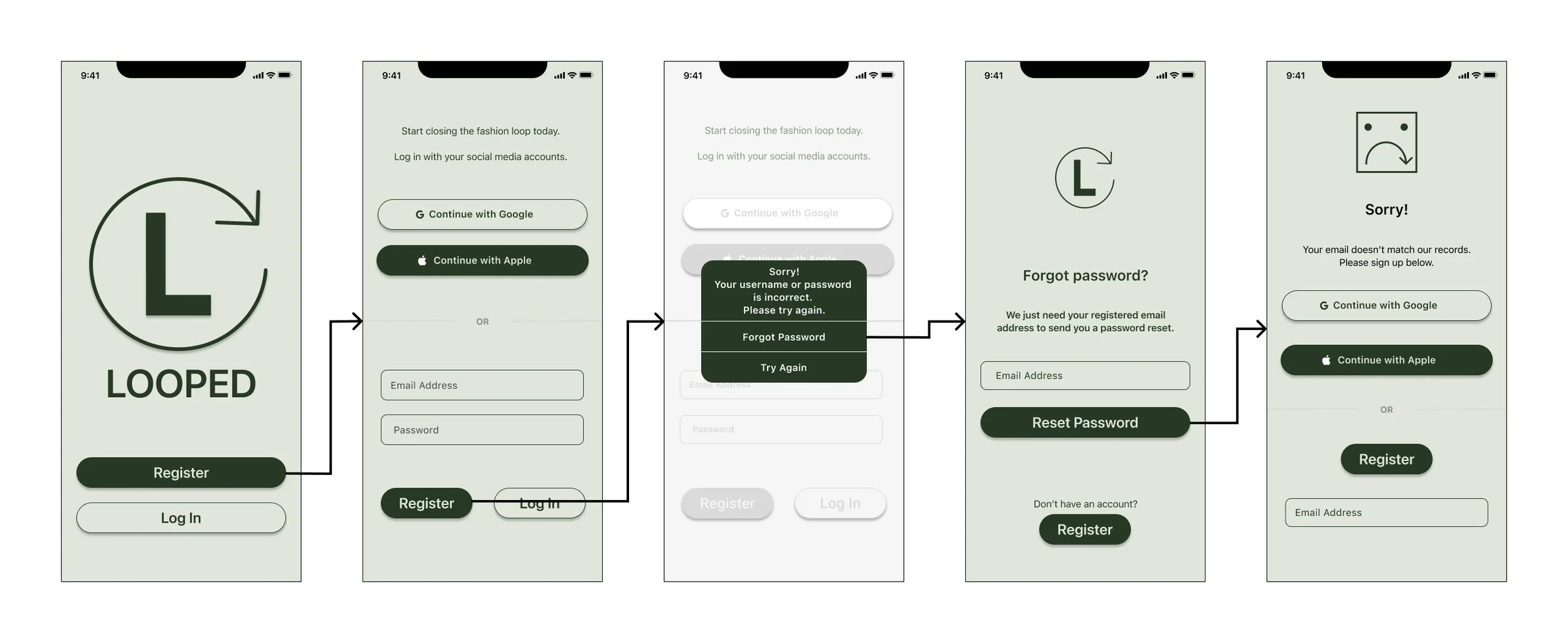 I also created a mood board and style guide to keep me consistent with my design across all screens. After much consideration and palette exploring, I chose a palette centered around a shade of sage green. I went green for the obvious association with being eco-friendly but sage for association of calmness and sophistication. My logo, an L with the arrow in a circle manner represents how Looped is helping to close the fashion loop.